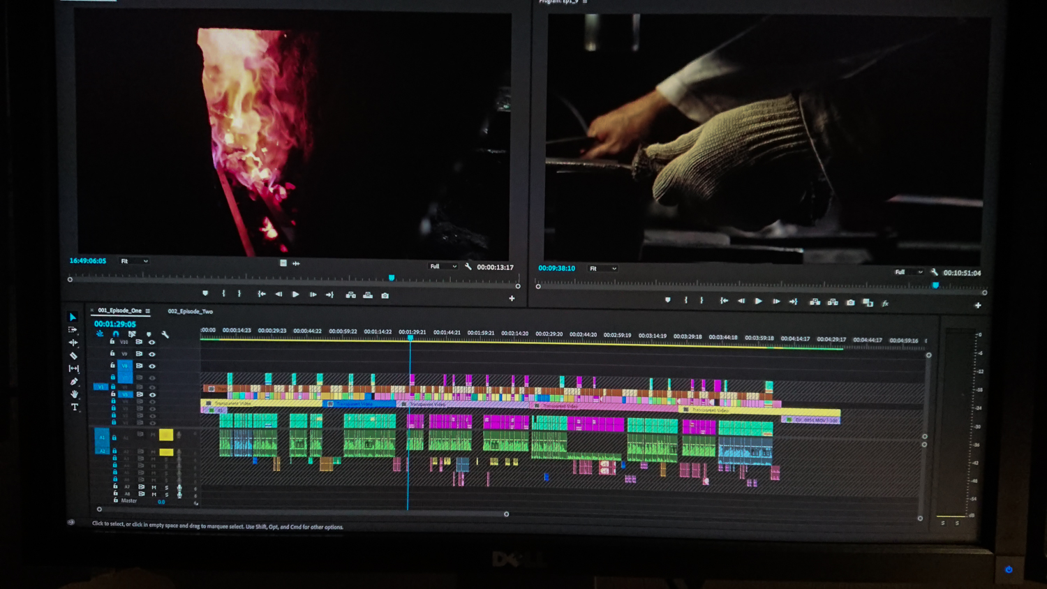 This image features a computer screen displaying a video editing software interface, likely Adobe Premiere Pro. The screen shows two video previews and an intricate timeline with multiple audio and video tracks. The left preview displays vibrant flames, while the right shows a close-up of